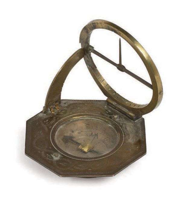 Cadran solaire équinoxial en laiton de forme octogonale avec boussole. Cadran des heures inclinable selon les latitudes (graduées sur un arc mobile). Le gnomon articulable. Signé au dos «Johan Schrettegger in Augsburg». Allemagne, fin du XVIIIe siècle.