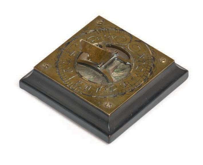 PETIT CADRAN SOLAIRE de table à boussole, rectangulaire, le cadran en laiton gravé et gnomon mobile, la boussole au dessous. Cadran signé J.B. Socle en bois noir en doucine. Peut-être Angleterre, XVIIIe siècle.