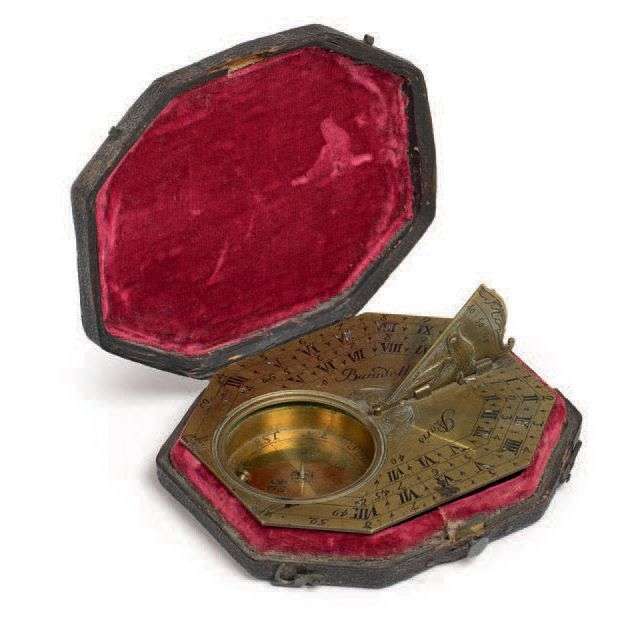 Cadran solaire octogonal de poche en laiton gravé, gnomon mobile, cadran à boussole. Signé. Dans son écin d'origine. Début du XVIIIe siècle.