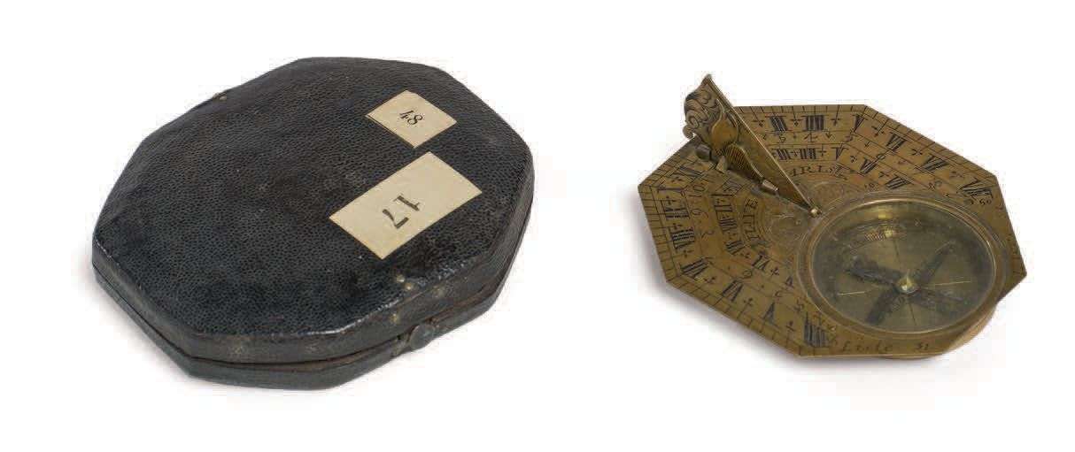Cadran solaire octogonal de poche en laiton gravé, gnomon mobile, cadran à boussole. Signé. Dans son écrin d'origine. Début du XVIIIe siècle. Anciennes étiquettes d'inventaires.