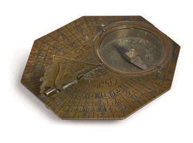 Cadran solaire octogonal de poche en laiton gravé, gnomon mobile, cadran à boussole. Signé. Début du XVIIIe siècle.