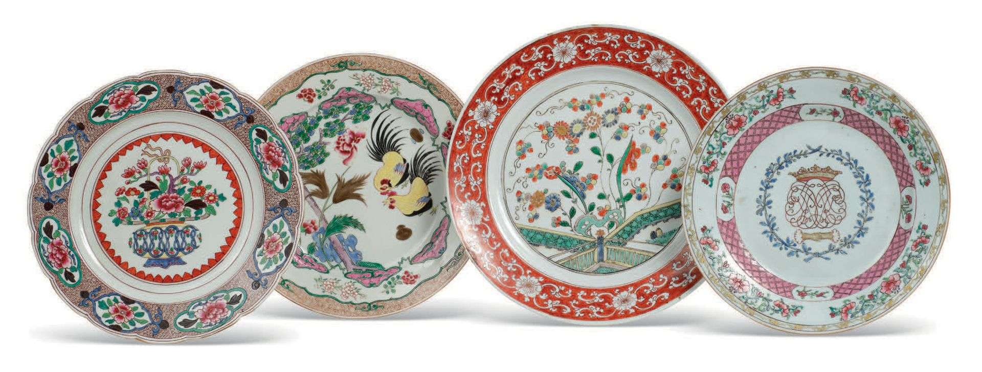Lot de quatre assiettes en porcelaine et décor peint polychrome. Mavelot héraldique, coqs famille rose, panier fleuri et jardin fleuri (marqué au dos). XVIIIe siècle.