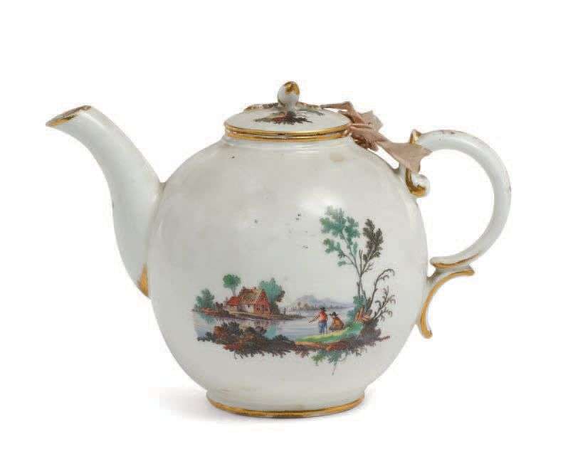 Théière couverte en porcelaine blanche à décor polychrome de personnages dans des payages sur les deux faces. Prise en forme de gland. Rehauts d'or. Marque : M.O.L. en bleu et D en creux. XVIIIe siècle, vers 1771 - 1784.