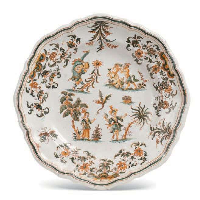 Assiette en faïence à décor polychrome peint de personnages grotesques. Marque d'Olérys. XVIIIe siècle.
