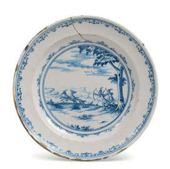 Assiette en faïence à décor en camaïeu bleu d'une chasse à l'arc d'après Antonio Tempesta. Premier tiers du XVIIIe siècle.