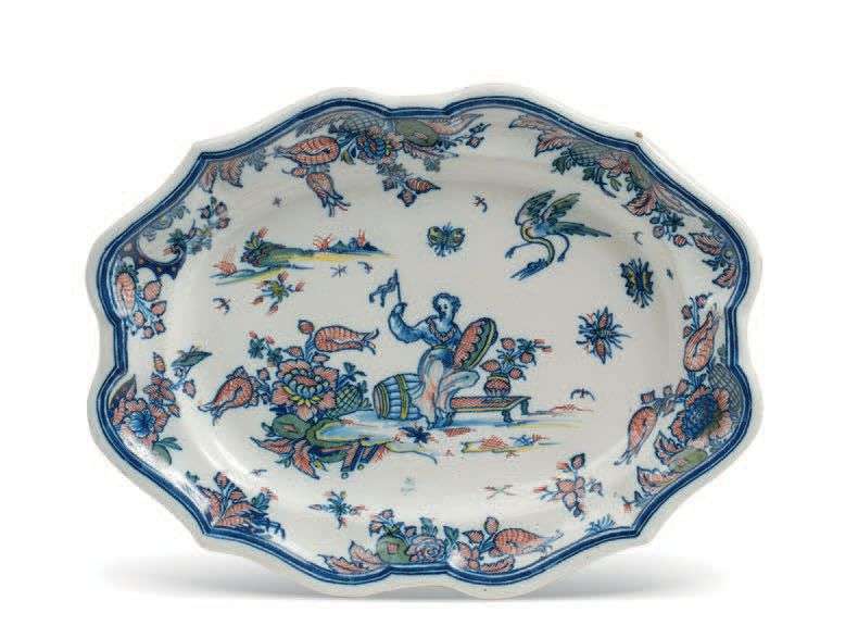 Plat oblong de forme chantournée en faïence, décor polychrome oiseau et personnage féminin. XVIIIe siècle.