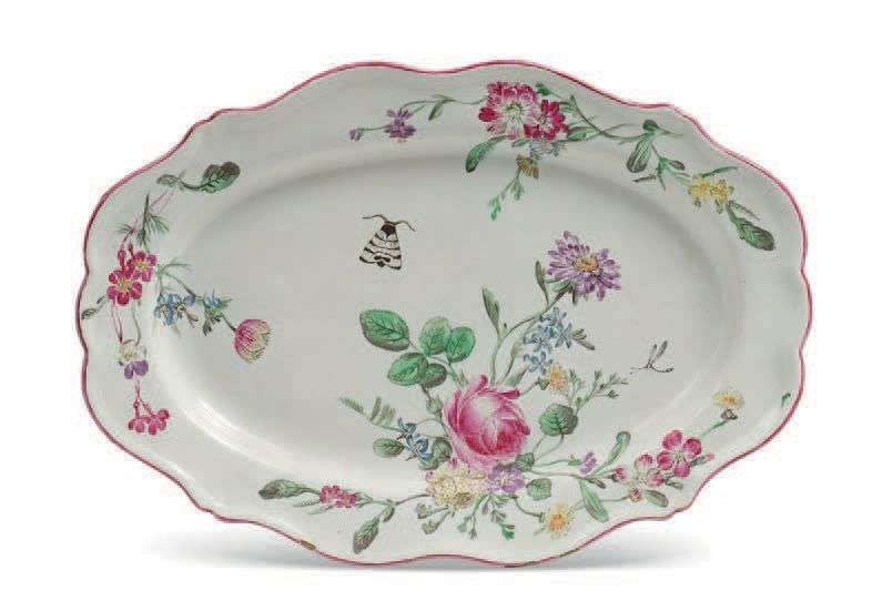 Plat ovale chantourné en faïence à fin décor peint de fleurs et papillon. Marque à la croix verte au dos. XVIIIe siècle. Étiquette de la collection Coustant d'Yanville (n°272) et collection Marcelle Gibert (n°95).