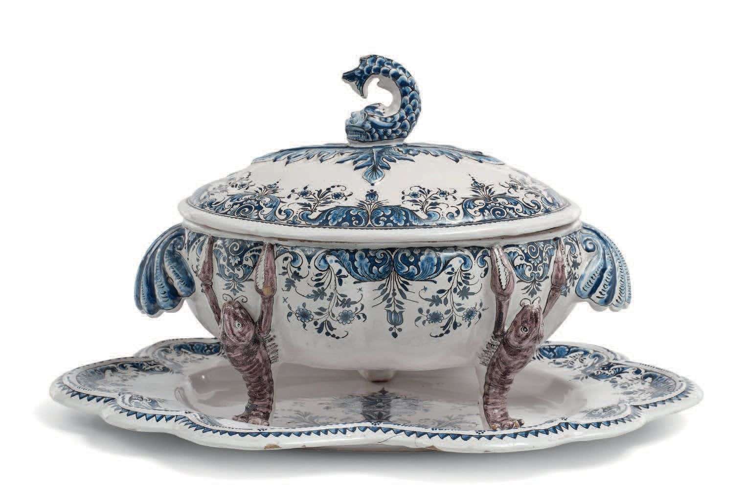 Terrine couverte ovale «aux écrevisses» à décor de lambrequins bleus, les prises latérales en coquilles. Les trois pieds en forme d'écrevisses violettes. Prise supérieure en forme de dauphin. Le dormant de forme contournée à décor de lambrequins bleus. Début du XVIIIe siècle, vers 1740.
