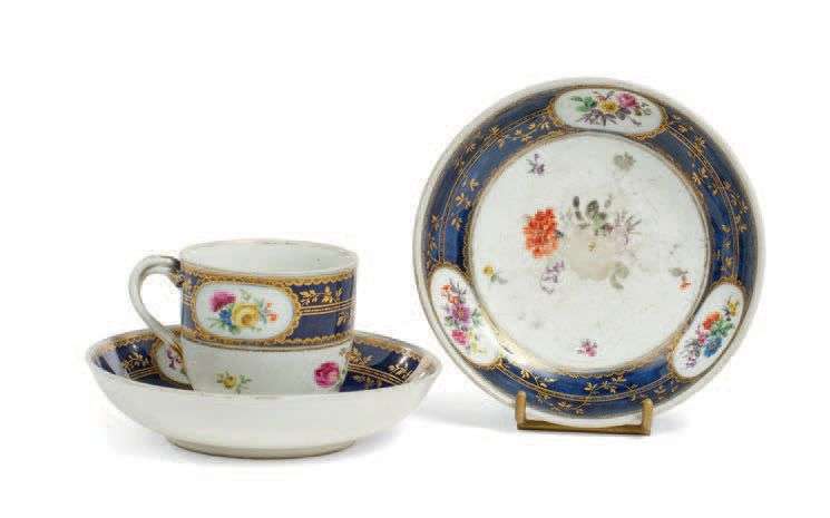 Une tasse et sa sous-tasse en porcelaine blanche à décor polychrome de bouquets dans des cartouches, fond bleu et or. Style du XVIIIe siècle