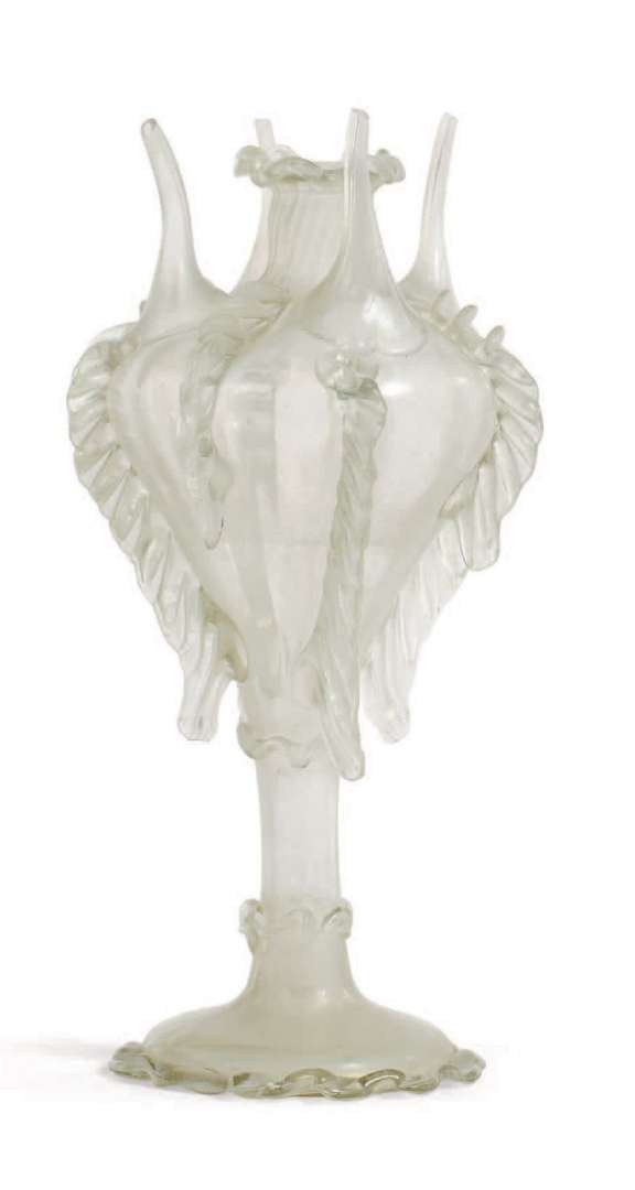 ALMORRATXA en verre soufflé incolore. Rare aspersoir à cinq orifices, de forme pansue sur haut pied. Espagne, Catalogne, XVIIIe siècle.
