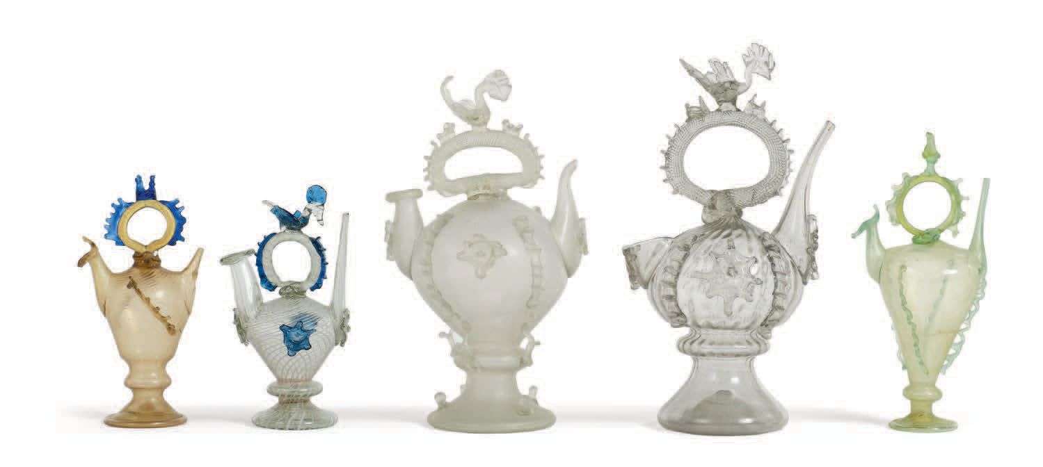 LOT DE CINQ CANTIRS de tailles et types divers. Certains à filli et rehaussés d'applications en verre bleu translucide profond. La panse caractéristique est munie de deux ouvertures tubulaires et est surmontée de l'anneau à l'oiseau plus ou moins stylisé en verre pincé. Espagne, Catalogne, XVIIIe siècle.