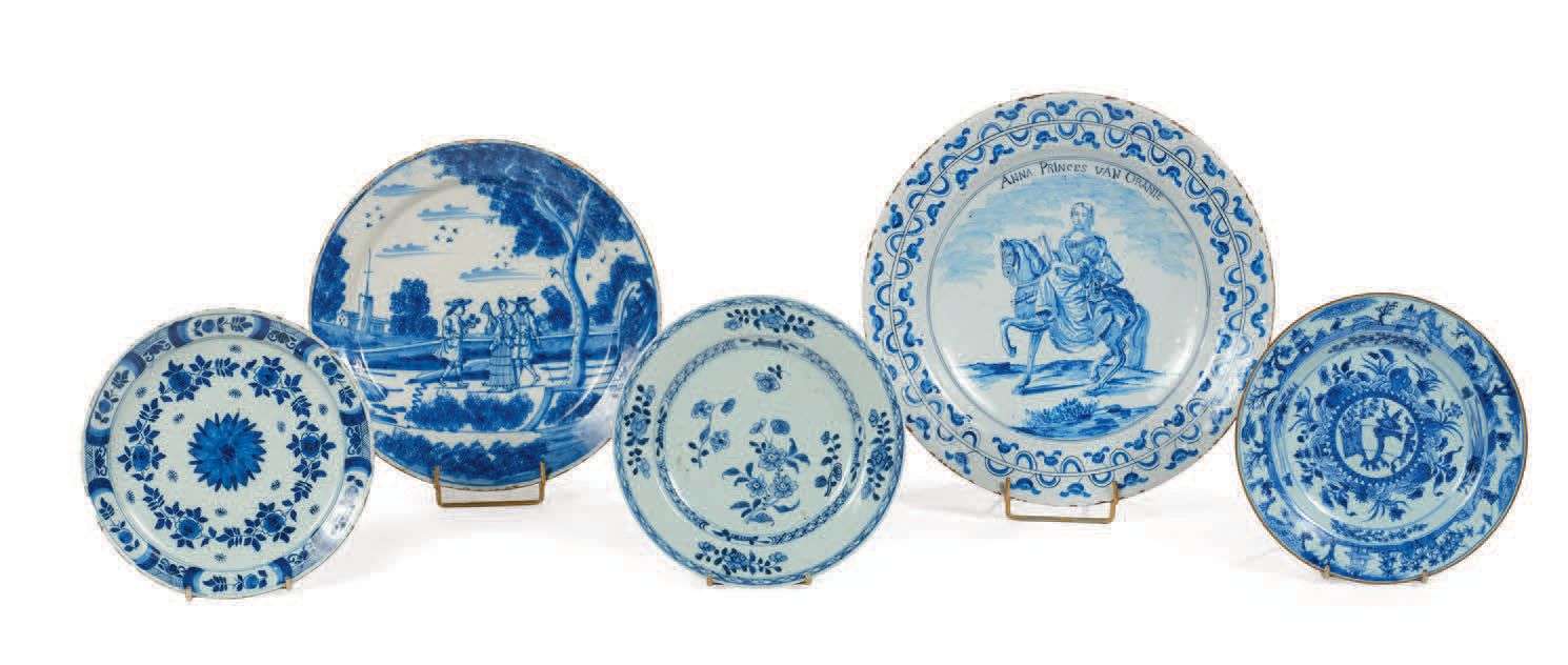 On y joint un plat à décor historié de personnages en faïence de Delft (Diamètre : 34,5 cm), une assiette florale en Delft et deux assietes en bleu et blanc de porcelaine de Chine pour l'exportation. XVIIIe siècle (petits accidents).