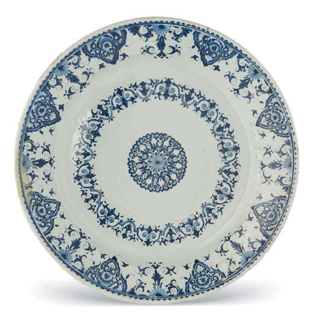 Grand plat rond en faïence décoré de lambrequins bleus encadrant un motif central rayonnant. Rouen, premier quart du XVIIIe siècle