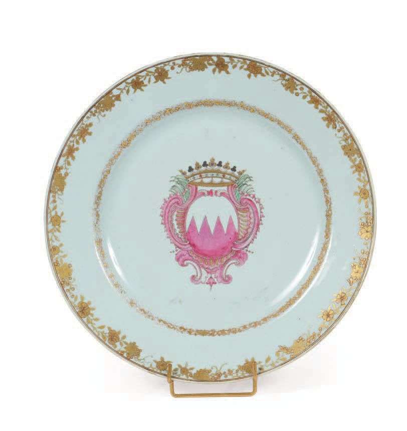 PAIRE DE PLATS AUX ARMES en porcelaine blanche et décor polychrome et or dans le style de la famille rose, à décor d'armoiries dans un cartouche sous une couronne de marquis. Chine pour l'exportation, XVIIIe siècle.