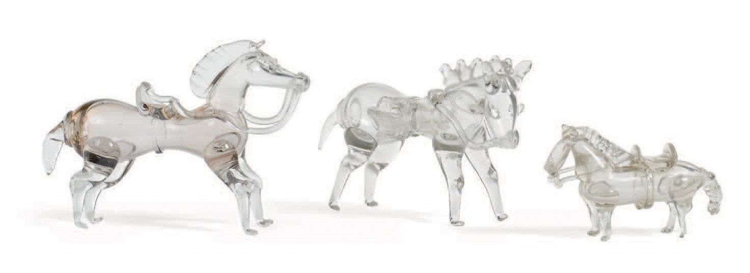 TROIS CHEVAUX EN «BOUSILLÉ» de verre translucide et incolore, l'un peut servir de porte-condiments. Nord de la France ou Belgique, fin du XVIIIe siècle, début du XIXe siècle.