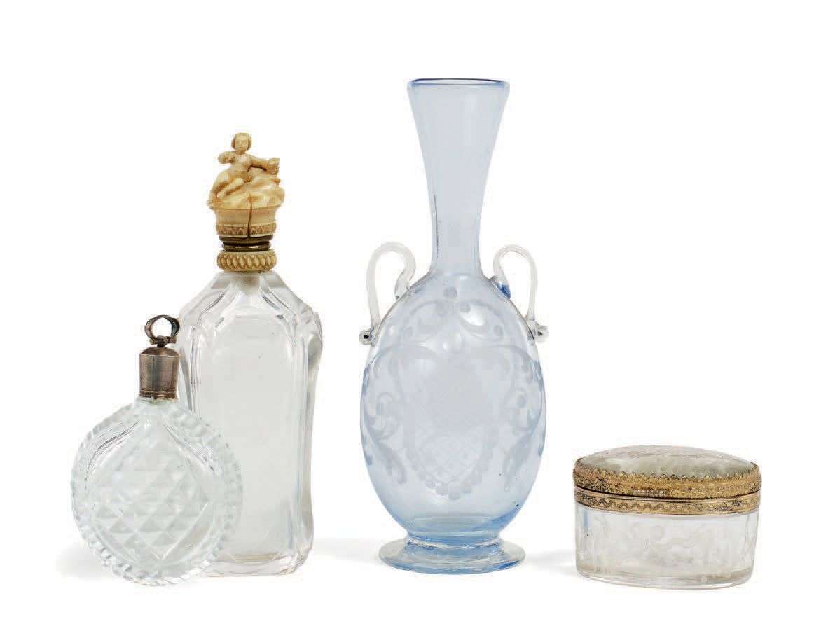LOT DE VERRERIES composé d'un petit vase en verre teinté bleu et gravé à la roue, d'une petite boîte gravée à la façon de Bohème, d'un flacon à sels pourvu d'un couvercle d'os sculpté d'un Bacchus, d'un flacon à sels en verre moulé pointe de diamant et gravé. XVIIIe et XIXe siècle.