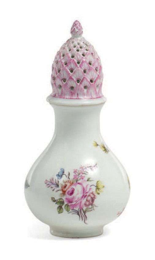Saupoudreuse à sucre de forme balustre en porcelaine blanche à décor polychrome de bouquets de fleurs et fleurs. Le couvercle en forme de tête d'asperge peint violet. Marqué au dessous aux épées croisées en bleu. XVIIIe siècle, vers 1730-1740.