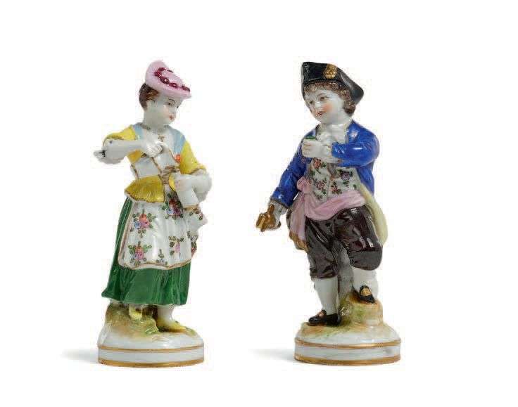 DEUX FIGURINES en porcelaine blanche peinte polychrome, représentant respectivement un jeune vigneron et son épouse. Marque de Aelteste Volkstedter. Allemagne, style du XVIIIe siècle.