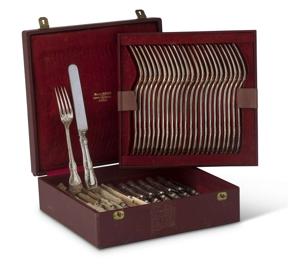 Partie de ménagère en argent et argent fourré modèle Louis XV à rocaille, toutes les pièces gravées aux armes d'alliance de la famille Mauduit du Plessix et Gazeau de La Brandasnières (alliées en 1892) sous une couronne comtale. Comprenant : 48 fourchettes de table 4540 g), 18 cuillères de table (1740 g), et 42 couteaux (18 lames d'acier et 24 lames d'inox, poids brut : 4212 g). Poinçon de maître orfèvre : Maison Odiot et Minerve. Dans deux écrins différents de la Maison Odiot.