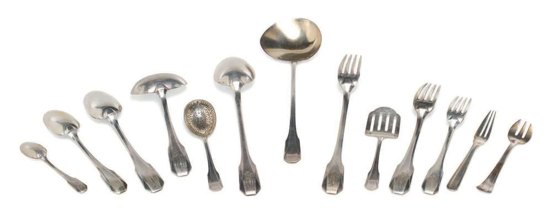 PARTIE DE MENAGÈRE en argent modèle Art Déco facettés. Composée de : - 18