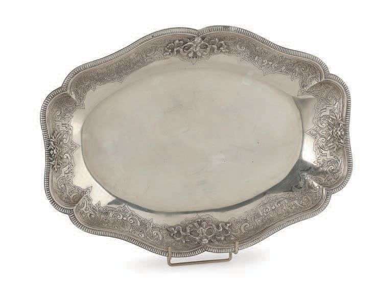 - Un plateau en argent ovale légèrement creux à décor de sirènes et têtes de faunes en relief, bordure de rinceaux gravés. Marqué Tiffany & Co Paris et Poinçon Minerve.