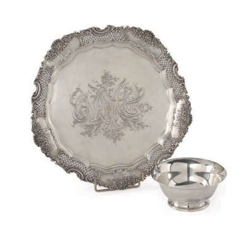 On y joint une jatte circulaire en argent uni sur piédouche marquée Tiffany & Co. Poinçon Minerve.