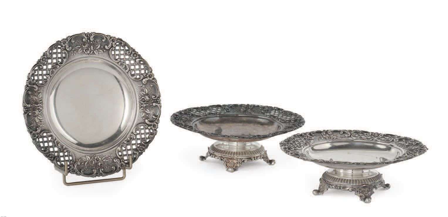 Suite de trois petits centres de table en métal argenté, circulaires sur pieds tripodes à décor floral ajouré en croisillons. Marqués Tiffany & Co Silver Soldered