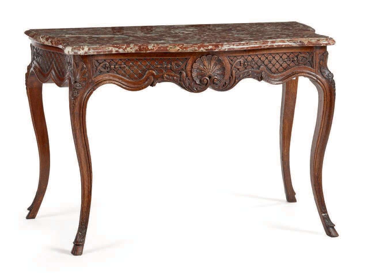 TABLE À GIBIER EN CONSOLE en chêne sculpté et mouluré au naturel, la large ceinture galbée est sculptée sur trois faces, à l'avant d'une coquille centrale sur fond de croisillons à fleurettes. Les quatre pieds cambrés, chutes sculptées en coquilles et pieds sculptés en sabots de biche. Dessus de marbre rouge du Languedoc mouluré en bec de corbin. France, style Régence.