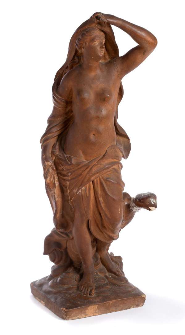 Sculpture allégorique en terre cuite représentant l'Air sous les traits d'une jeune femme debout sur un nuée, à peine couverte d'un voile en léger mouvement. D'un geste délicat, elle soulève le voile enroulé autour de ses formes pour se couvrir la tête. À ses pieds derrière elle se trouve un aigle relevant la tête tandis qu'un caméléon est caché dans les plis du drapé, à sa droite. France, XVIIIe siècle.