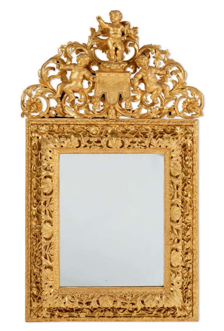MIROIR AJOURÉ AU GONFALON en bois finement et richement sculpté et doré. L'encadrement rectangulaire est fait en bois ajouré à décor de coquilles, feuillages et fleurs avec des écoinçons en forme de feuilles d'acanthe. Le fronton richement sculpté et orné de volutes présente trois putti encadrant un gonfalon à trois pointes terminé par des glands de passementerie. Glace au mercure ancienne. Italie, XVIIIe siècle.