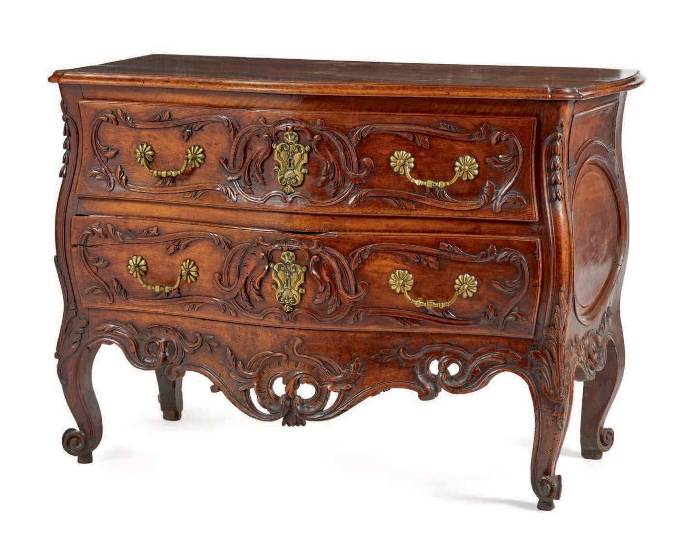 COMMODE PROVENÇALE en bois de noyer sculpté mouluré au naturel galbée toute face, ouvrant par deux tiroirs sur deux rangs en ceinture à décor richement sculpté et tablier ajouré. Ornementations de bronze doré aux entrées de serrure et poignées de tirage. Provence, XVIIIe siècle.