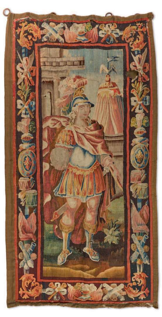 PORTIÈRE à l'effigie d'Alexandre le Grand, représenté près d'une tente en contre-fond à droite lors d'un départ à la guerre. La bordure à décor de trophées enrubannés, casques, tambours entourés de poissons, et drapés en polychromie en laine et soie. Tapisserie de Felletin, région Aubusson, Fin du XVIIe - début du XVIIIe siècle.