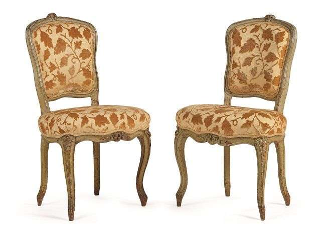 PAIRE DE CHAISES en hêtre mouluré sculpté laqué gris, à décor de fleurettes, les pieds cambrés. Anciennement à cannage. Époque Louis XV.