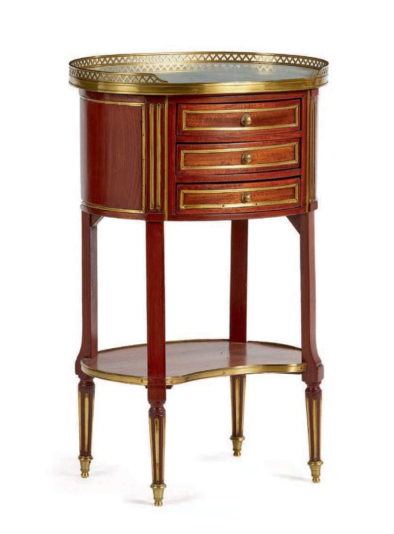 PETITE TABLE DE SALON volante de forme ovale en acajou et placage d'acajou, elle ouvre à trois tiroirs en partie supérieure. Plateau entretoise de forme rognon en partie inférieure à lingotière. Montants et pieds à cannelures de laiton. Plateau de marbre blanc à galerie ajourée de coeurs en bataille. XVIIIe siècle.