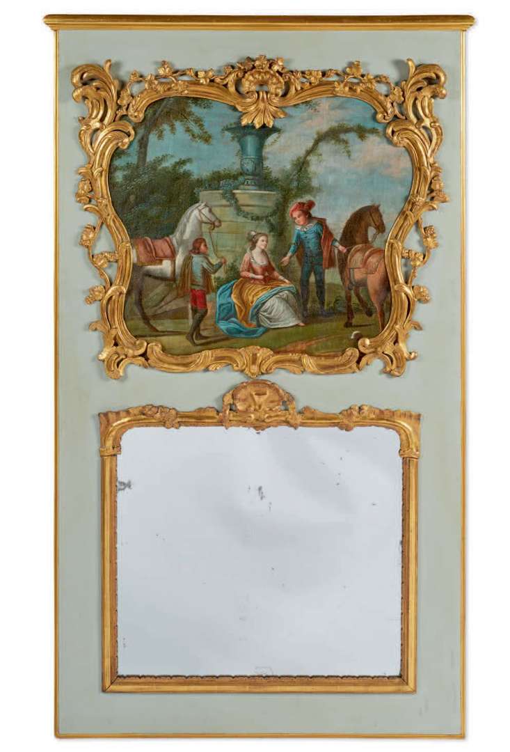 TRUMEAU de bois sculpté et doré sur fond vert anis, partie haute à toile peinte d'une scène galante et glace en partie basse. Époque Louis XV.