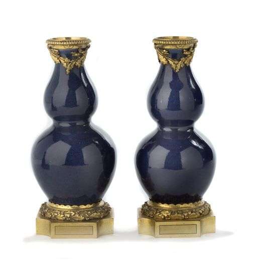 PAIRE DE VASES montés en bronze doré. Les vases en porcelaine émaillée bleue en forme de double gourde à la manière chinoise. Monture en bronze ciselé et doré à décor de feuilles de chêne. Monture à la base et au col. Seconde moitié du XIXe siècle.