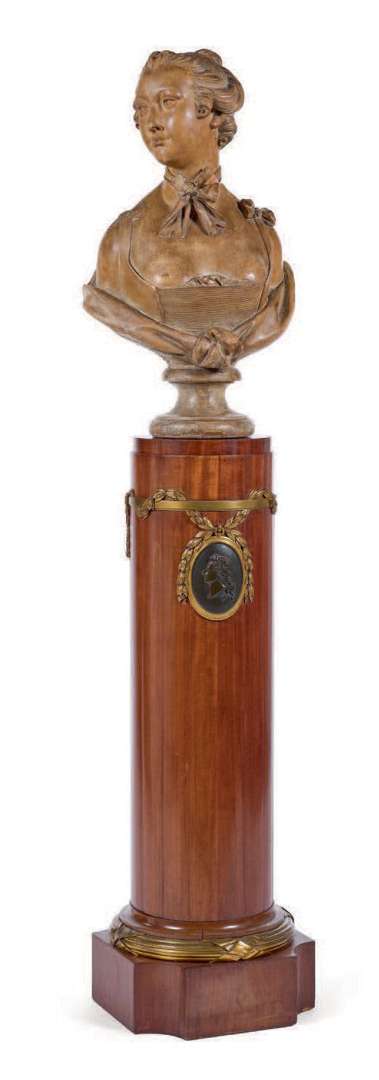 On y joint une gaine colonne plaquée d'acajou et enrichie de bronze au portrait de Louis XV en médaillon et ornementation de laiton vernis.