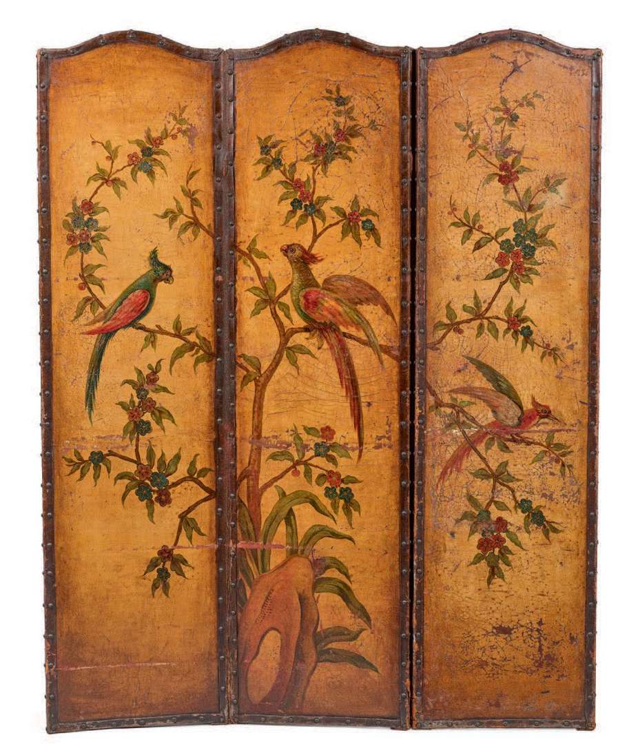 PARAVENT de trois panneaux de cuir à fond doré où figurent des oiseaux exotiques perchés dans des branches. XVIIIe siècle.