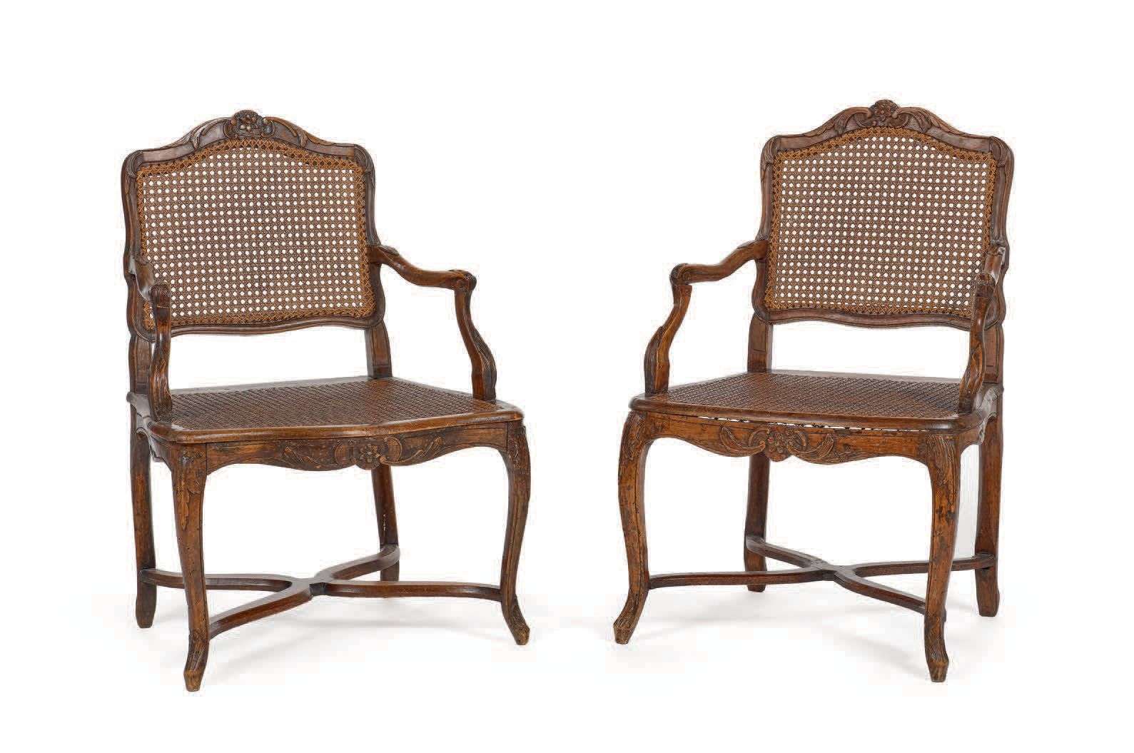 PAIRE DE FAUTEUILS CANNÉS à dossier plat en bois sculpté laissé au naturel. Consoles d'accotoirs en léger retrait et coup de fouet. Époque Louis XV.