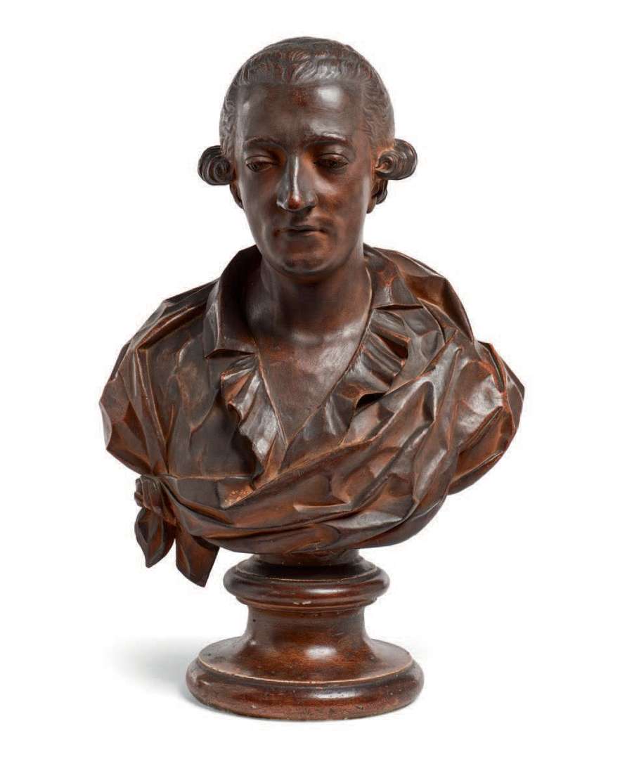 Buste de Marie-Louis-Henri d'Escorches, marquis de Sainte-Croix, ministre plénipotentiaire à Liège de 1782 à 1791. Signé au dos Gathy. Terre cuite, sur un piédouche circulaire en plâtre.