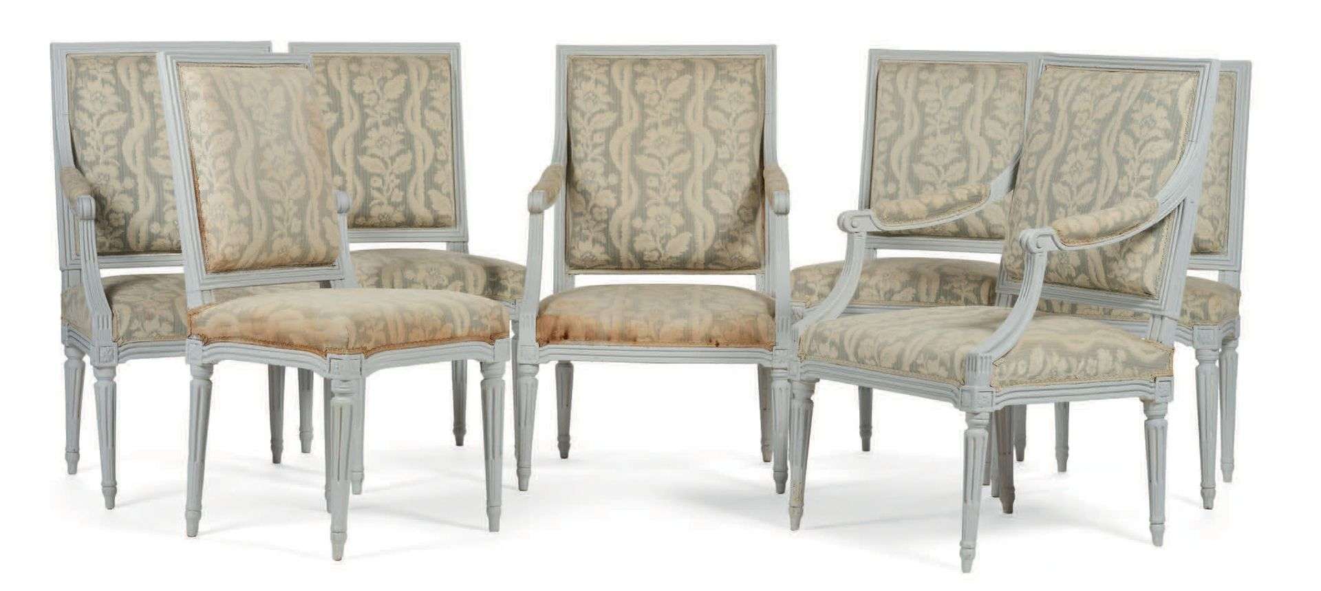 PARTIE DE SALON LOUIS XVI composée de trois fauteuils à dossiers fer-de-bêche et quatre chaises assorties en bois sculpté, mouluré, relaqué gris. Les pieds fuselés cannelés rudentés. La plupart estampillés Jean-Baptiste Lebas (1729 - 1795).