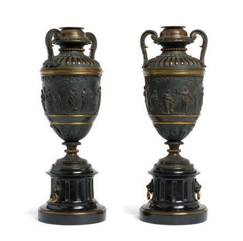 PAIRE DE PIEDS DE LAMPES à pétrole en forme de vase antique à anses, décor de godrons et frise de musiciens (signée H'H. Ver ?) reposant sur un piédouche lui-même sur un pied en colonne cannelée de marbre noir avec prises latérales en têtes de lions en bronze. France, deuxième moitié du XIXe siècle.