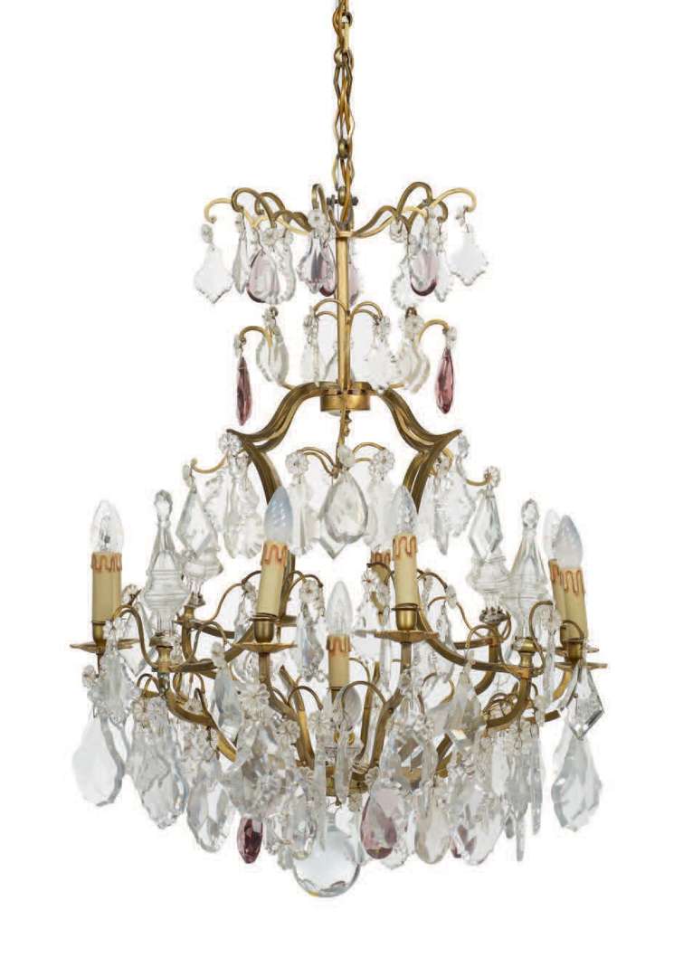 LUSTRE CAGE en métal et nombreuses pampilles de verre incolore et fumé violet. Il offre treize lumières dont huit à bras. Style du XVIIIe siècle.