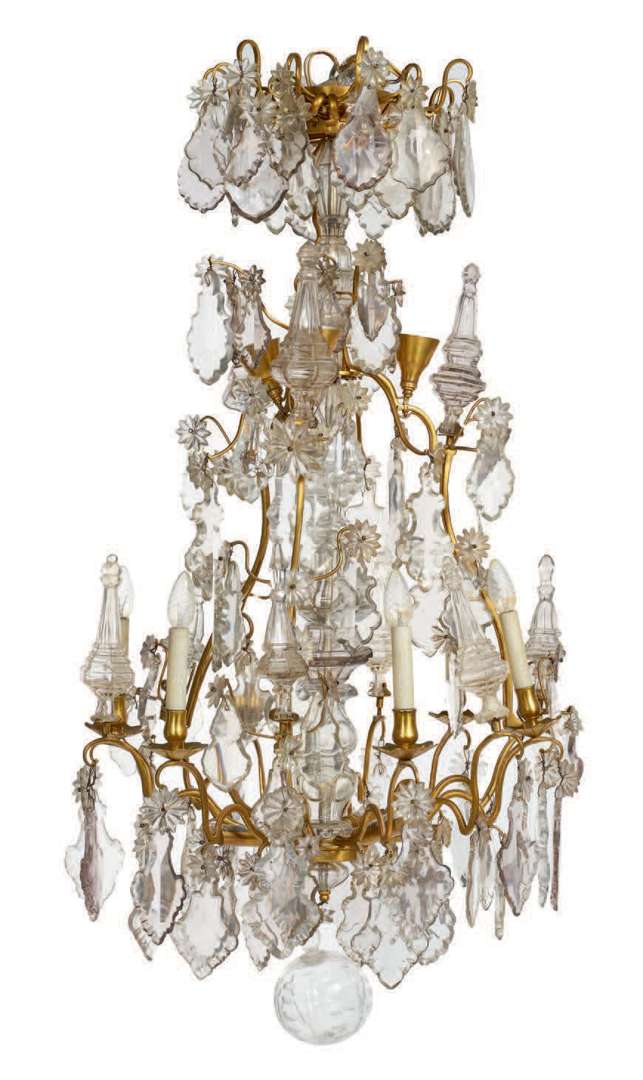 GRAND LUSTRE CAGE en métal et nombreuses pampilles et poignards de verre moulé et taillé. Il offre dix-huit lumières dont six à bras. Style du XVIIIe siècle.