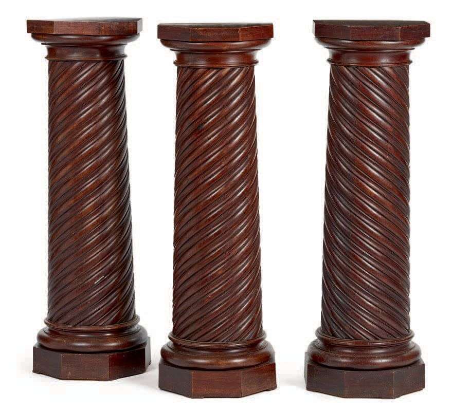 TROIS SELLETTES COLONNES en bois sculpté le fût torsadé surmonté d'un chapiteau dorique, repose sur une base moulurée et un socle octogonal. Travail moderne.
