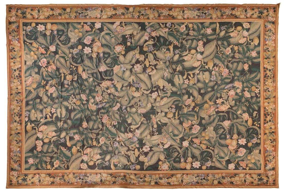 TAPIS FEUILLES DE CHOUX en laine sur fondations en coton, technique de la tapisserie. Travail à l'aiguille à décor de feuilles de choux dites à l'aristoloche (que l'on retrouve dans les tapisseries Audenardes des XVe et XVIe siècles), entourées de branchages de fleurs stylisées en polychromie. Large bordure principale à fruits et cordons de gerbes fleuries multicolores.