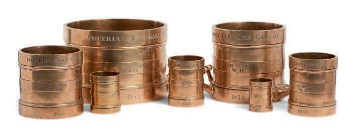SUITE DE SEPT MESURES ANGLAISES du département de la guerre, en cuivre de forme cylindrique, étalon pour la mesure des gallons. Chaque mesure gravée : HM (Her Majesty's) et WD (War Department) et année 1875 et respectivement : Imperial two gallon, Imperial gallon, Imperial half gallon, Imperial quart, Imperial pint, Imperial half-pint, Imperial gill. Poinçons divers. Gravés De Grave Shorts & Co London. Royaume Uni, époque Victorienne, seconde moitié du XIXe siècle, 1875.