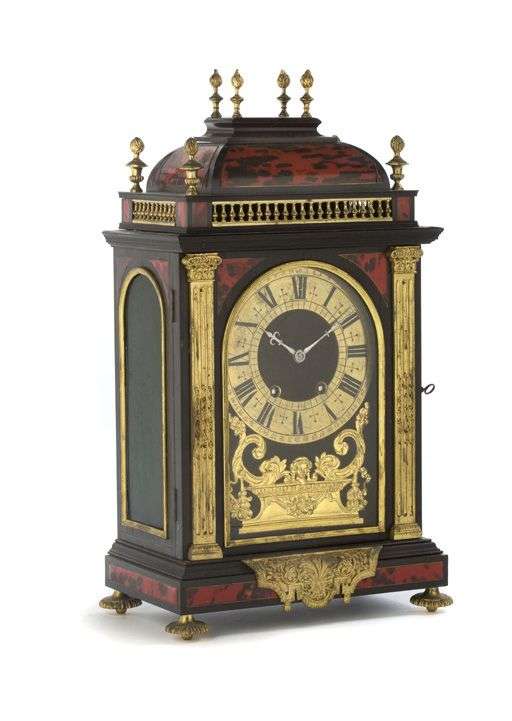 PENDULE RELIGIEUSE en bois noirci de forme rectangulaire marquetée en placage écaille rouge mouchetée. Garniture d'ornements en laiton doré. Le cadran affichant les heures en chiffres romains et les minutes en chiffres arabes sur fond de velours. Repose sur quatre pieds en toupie. Style Louis XIV.