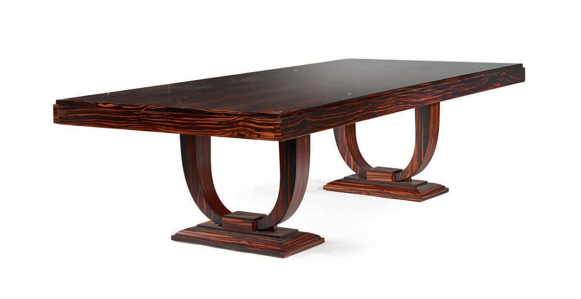 GRANDE TABLE de salle à manger en placage d'ébène de Macassar, le plateau rectangulaire reposant sur deux pieds à patins à arches inversées. Style Art Déco.