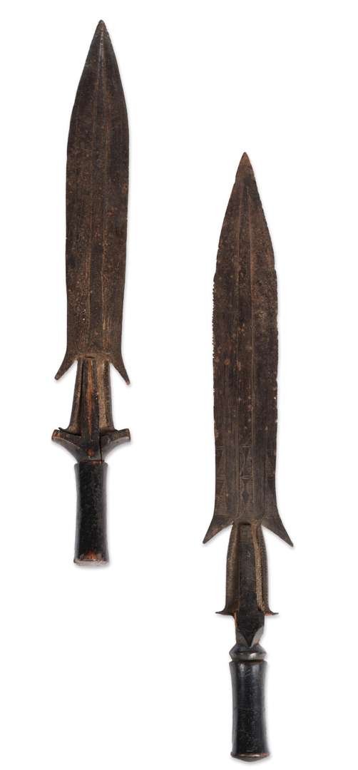 DEUX COUTEAUX FANG à lame de fer forgé et gravé et poignée de bois. Fang, Gabon, fin du XIXe siècle.